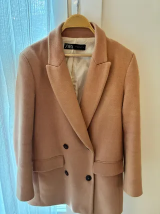 Elegante abrigo de Zara en un bonito tono rosa. Perfecto para añadir un toque de estilo a tu vestuario. - Diseño de doble botonadura. - Cuello solapa clásico. - Bolsillos frontales con solapa.