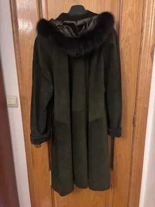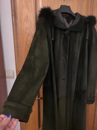 Elegante abrigo largo de ante en tono verde oliva. Perfecto para añadir un toque sofisticado a tu vestuario. - Material: Ante - Color: Verde oliva - Diseño: Largo con capucha, se puede quitar - Detalles: Adornos en puños