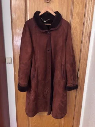 Elegante abrigo largo de ante en tono marrón. Con borreguillo, muy caliente - Cierre de botón. - Bolsillos laterales. - Detalle bordado en la parte inferior.