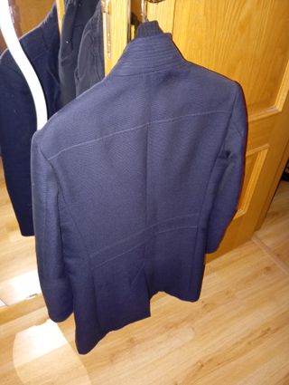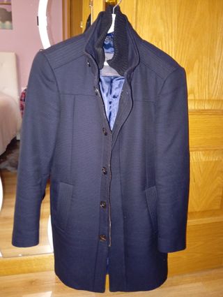 Elegante abrigo de vestir de la marca Zara. - Color azul marino. - Diseño moderno con cuello alto. - Cierre de botones y cremallera. - Bolsillos frontales. - Forro interior azul.