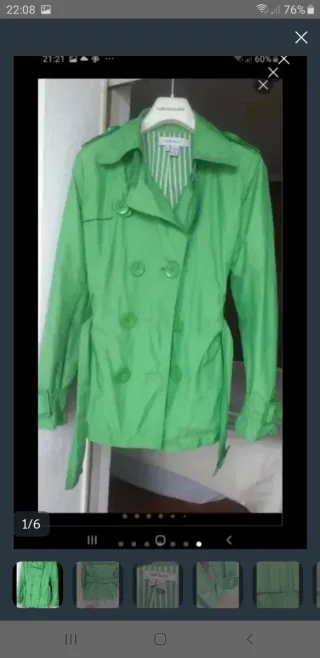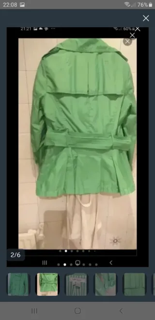 Gabardina corta de la marca Zara en color verde. Presenta un diseño de doble botonadura y cinturón. - Cuello solapa. - Puños ajustables. - Forro interior a rayas.