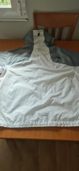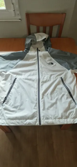 Cortavientos The North Face con diseño bicolor. Talla XL - Mangas grises y cuerpo blanco. - Cremallera frontal. - Bolsillos laterales con cremallera. Tiene una pequeña mancha en la parte frontal , pero no se aprecia puesta.