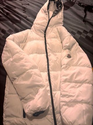 Abrigo Moncler en color blanco, usado solo una vez y en perfecto estado. - Diseño acolchado. - Capucha integrada. - Cremallera frontal.