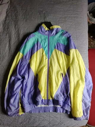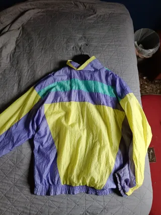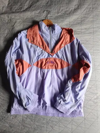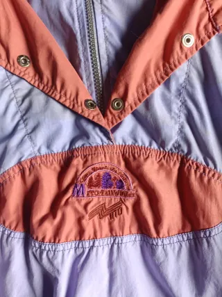 Cortavientos estilo vintage con un diseño llamativo. - Combinación de colores morado y naranja. - Cremallera frontal. - Puños y cintura elásticos. -Talla 46
