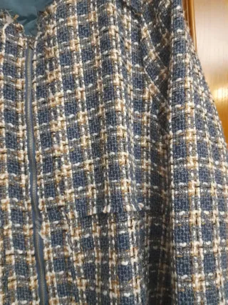 Abrigo de entretiempo con un diseño de cuadros en tonos azules y multicolor. Cierre de cremallera. - Cuello redondo. - Manga larga. - Forro interior. -Cómodo y ligero Por favor, Cualquier duda en talla o medidas ,preguntarme .