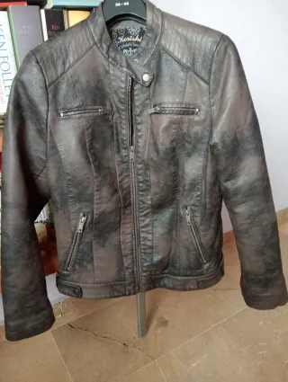 Cazadora de piel color cuero viejo. Forrada con pelito.con un diseño moderno y detalles únicos. Puesta tres veces - Cuello mao. - Cierre de cremallera. - Bolsillos frontales con cremallera. - Puños ajustados.