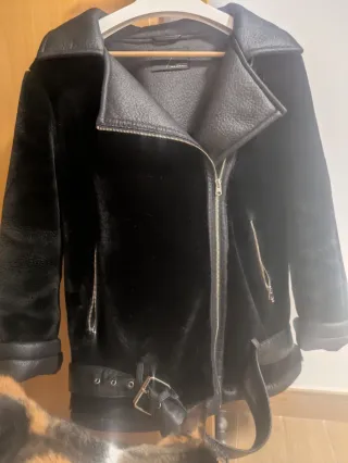 Abrigo acolchado reversible de Zara. Un lado es negro brillante y el otro es negro mate con pelo. - Diseño acolchado. - Cuello con pelo. Tiene gorro también