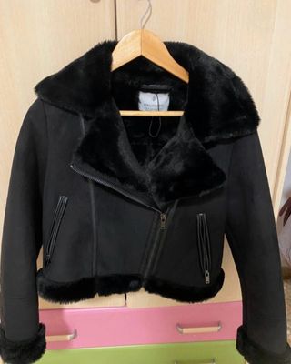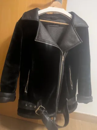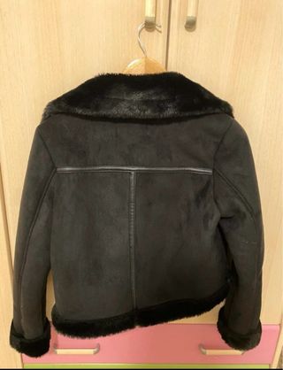 Abrigo estilo aviador de Stradivarius. - Diseño corto y moderno. - Forro interior de pelo sintético. - Cuello amplio con pelo. - Cierre de cremallera asimétrica. - Puños y bajo con detalle de pelo.