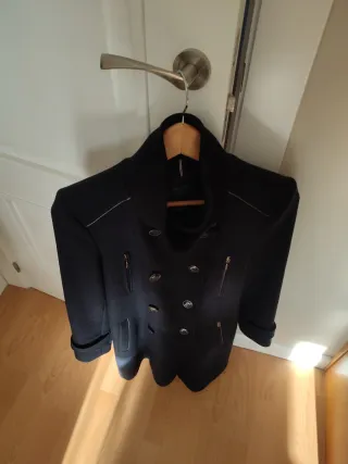 Elegante abrigo negro con detalles metálicos. - Cierre frontal con cremallera dorada. - Bolsillos laterales con cremalleras doradas. - Cuello mao.