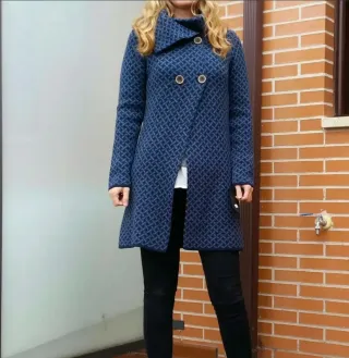 Elegante abrigo con un diseño original - Cuello alto con solapa cruzada. - Cierre de botones. - Estampado geométrico en tonos azules y grises. -Comprado en un viaje, muy poco uso. Talla como 38-40 Zara Mango Bsk Pull and bear Cortefiel Stradivarius