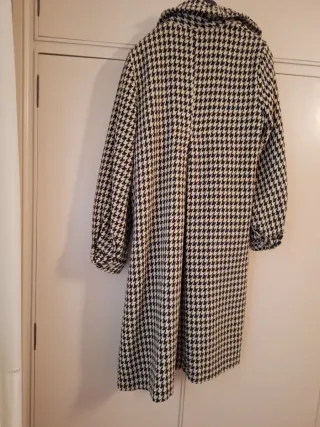 Abrigo vintage de los años 80 de estilo minimalista y manga murciélago. Corte abierto (sin botones), fluido y elegante. Detalle estructurado en los hombros que le da una silueta potente y retro. Bolsillos delanteros funcionales. Color gris jaspeado (estampado geométrico en blanco y negro). Forro interior en perfecto estado. Muy buen estado general, poco uso. No tiene etiqueta, por lo que desconozco marca (aunque parece artesanal). Talla aproximada: L/44. Tacto suave y cálido.