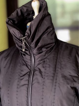 Abrigo acolchado con detalles en ante marrón - Cierre de cremallera. - Bolsillos laterales con ribete. - Cuello alto con detalle de canalé.