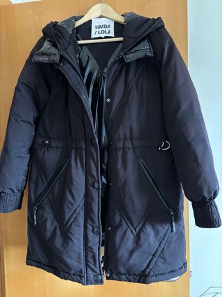 Abrigo largo de la marca Bimba y Lola en color negro. - Diseño acolchado. - Capucha. - Cintura ajustable. - Puños elásticos.