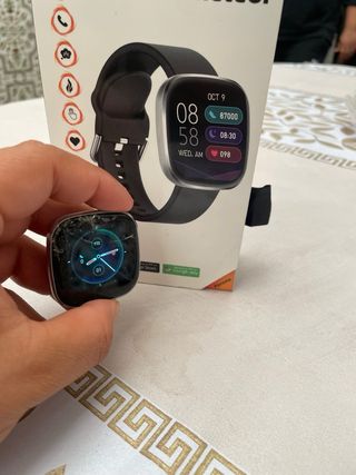 Reloj inteligente con pantalla negra y cable de carga blanco. - Diseño compacto. - Incluye cable USB para carga.