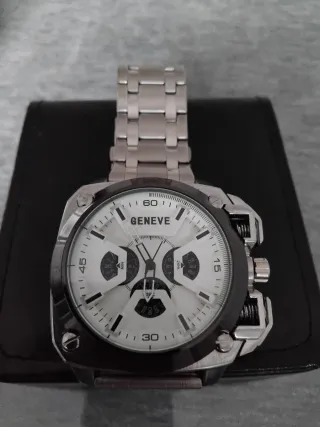 Elegante reloj con diseño moderno. - Esfera blanca con detalles en negro. - Correa de eslabones plateados. - Bisel exterior en tono oscuro.
