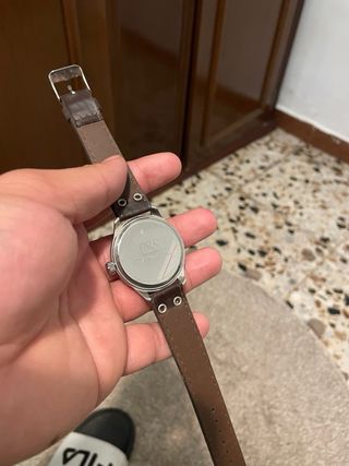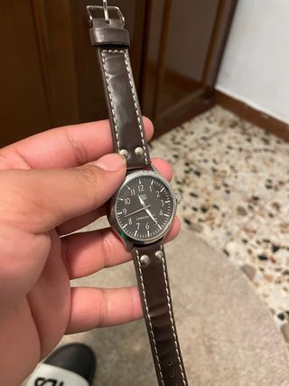 Reloj con correa de cuero marrón. - Correa de cuero con costuras blancas. - Hebilla metálica.