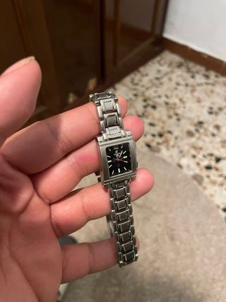 Elegante reloj de pulsera con un diseño moderno. - Correa de eslabones metálicos. - Esfera rectangular. - Detalles en contraste.