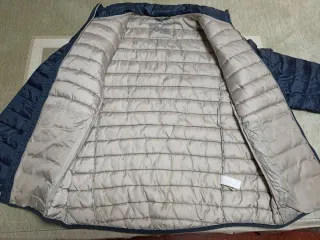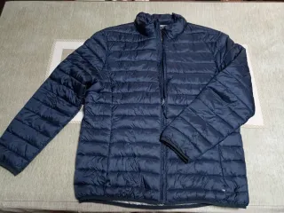 Anorak acolchado de color azul marino, perfecto para el frío. - Cierre de cremallera. - Cuello alto. - Mangas largas. Tiene una pequeña quemadura