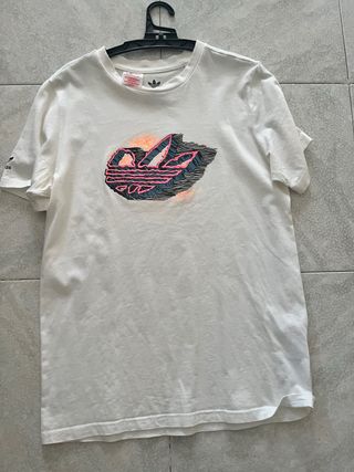 Camiseta blanca de Adidas con un llamativo logo en la parte delantera. - Diseño del logo en tonos rosa, azul y naranja. - Logo de Adidas en la manga izquierda.