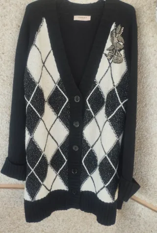 Cárdigan oversize con estampado argyle en contraste. - Diseño de rombos en blanco y negro. - Detalle de abalorios en la solapa con madreperlas - Cierre de botones. - Puños y bajo de canalé.
