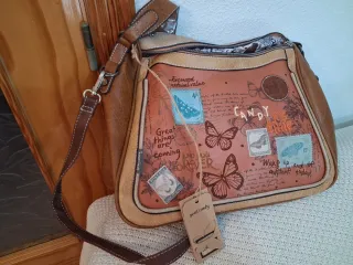 Bolso de chica con un diseño único y llamativo, con detalles de mariposas y sellos postales. - Estampado con mariposas y texto. - Cierre de cremallera. - Correa ajustable para llevar al hombro.