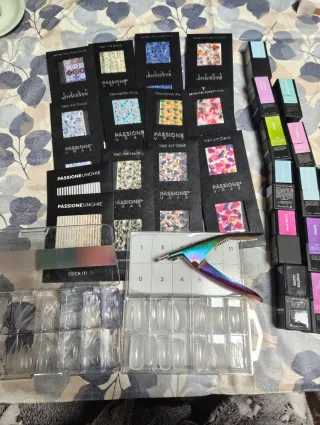 Set de nail art con varios diseños y accesorios de la marca Passione Uñas. - Diseños de transferencia y decoración. - 11 papel foil de diferentes temáticas ( primavera, Halloween, verano...) - Tips soft gel de diamante. - Tips bailarina. - Gel tips ballerina. - Dual forma cuadrados. - Variedad de estilos y patrones. - 14 esmaltes en gel. Todo está usado y abierto. De alguna caja de tips faltarán alguna unidad, pero están casi todas.
