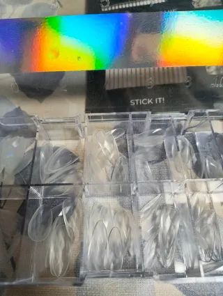 Set de manicura con uñas postizas y accesorios. - Uñas postizas de diferentes formas y tamaños. - Moldes dual forma almendra rusa. - Adhesivos para uñas. - Rollo de foil para decoración. - Tíos para muestrario. No está sin entrenar. En algunas cajas faltarán tíos, pero están casi enteras.