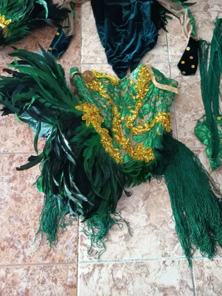 Conjunto de traje de carnaval con detalles en verde y dorado. - Diseño con plumas y adornos. - Pantalones largos con aplicaciones. - Piezas para torso y cabeza.