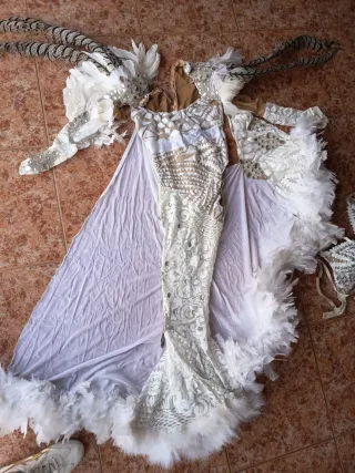 Este traje de carnaval es una pieza llamativa y elaborada. - Diseño intrincado con detalles dorados y blancos. - Adornado con plumas y lentejuelas. - Estilo sirena con una cola larga. - Incluye mangas y un tocado a juego.