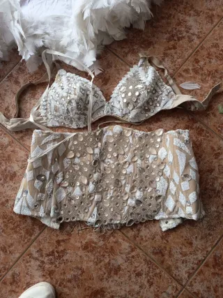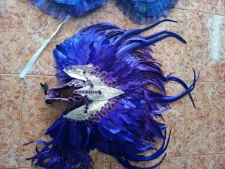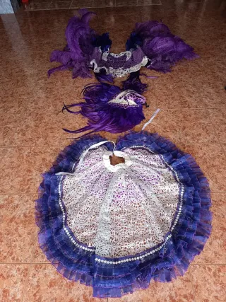 Conjunto de carnaval con un diseño llamativo. - Adornado con plumas moradas. - Incluye máscara y falda. - Detalles en encaje blanco y plateado.