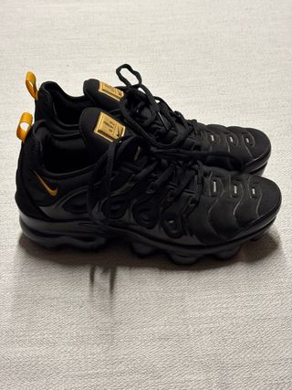 Zapatillas Nike Air Vapormax Plus en talla 40. Combinan un diseño moderno con detalles dorados. - Parte superior textil. - Suela con tecnología Vapormax Air. - Cierre con cordones.