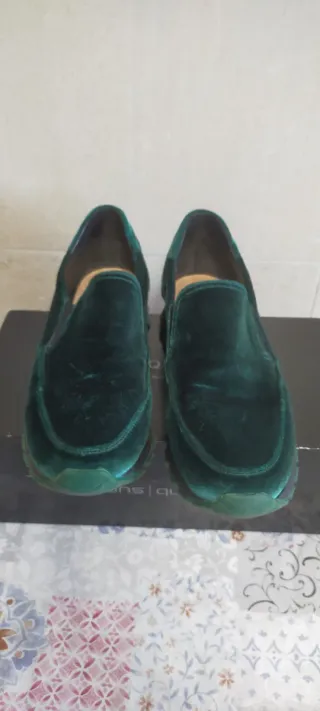 Elegantes zapatos de terciopelo verde. - Tienen un poco de plataforma. - Material: Terciopelo. - Diseño slip-on. - Suela de goma.