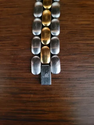 Elegante reloj de pulsera de la marca Michele, con un diseño bicolor que combina tonos dorados y plateados. - Indicador de fecha.