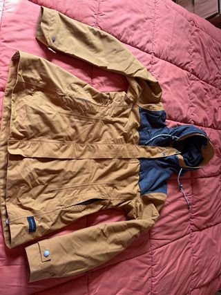 Chaqueta versátil de la marca Quechua, ideal para actividades al aire libre. - Diseño 2 en 1. - Combinación de colores marrón y gris.