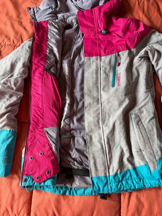 Chaqueta de nieve O'Neill con un diseño moderno y funcional. - Combinación de colores gris, rosa y turquesa. - Capucha integrada. - Cremallera frontal. - Bolsillos laterales con cremallera.