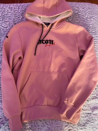 Sudadera con capucha rosa con elástico a rayas blancas y negras en puños y cintura Mide ancho. 52 Largo 50 Muy buen estado