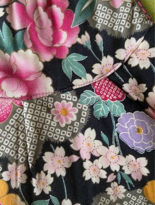 Bolso de mano con un diseño floral vibrante y un cierre de boquilla. - Hecho a mano. - Estampado de flores en tonos rosas, amarillos y morados sobre fondo negro. - Cadena metálica para llevar al hombro.