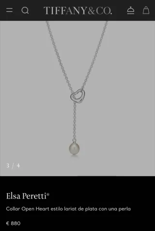 Vendo collar original de Tiffany & Co., modelo Elsa Peretti Open Heart estilo lariat en plata de ley con perla. Está completamente nuevo, nunca usado. Se entrega con su bolsita de tela y con la caja original de Tiffany. Precio en tienda: 880€. Me lo regalaron al irme de un trabajo y aunque me parece muy bonito, no es mi estilo y lleva más de un año en la caja.