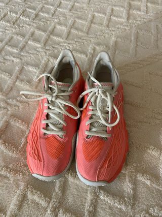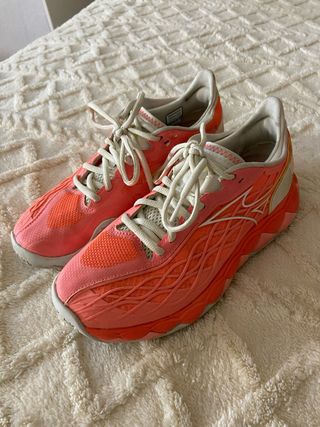 Zapatillas deportivas Mizuno en tonos naranja y rosa. - Diseño deportivo. - Cierre con cordones.