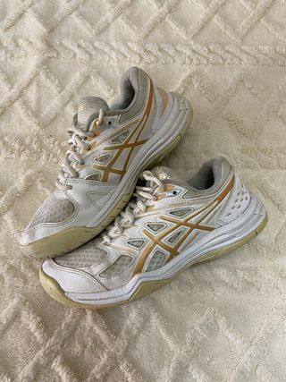 Zapatillas deportivas Asics para mujer. - Diseño en color blanco con detalles dorados. - Modelo Unicourt 4.