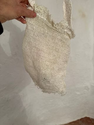 Bolso de mano tejido a crochet con un diseño único. - Tejido de hilo blanco. - Adornos en tonos rosas y azulados. - Asa tejida a juego.