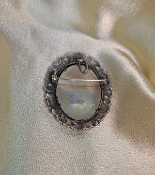 Precioso broche y colgante de estilo Modernista. - Elaborado en Plata 800. - Diseño ovalado con detalle de retrato. - Marco ornamental con motivos florales. - Sello 800 en la parte trasera. - Medidas: 4,7 cm x 3,9 cm