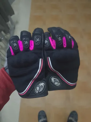 Par de guantes de moto con detalles en rosa y blanco. Talla M - Diseño con protecciones en los nudillos. - Materiales transpirables en la zona de la palma. - Cierre ajustable en la muñeca.