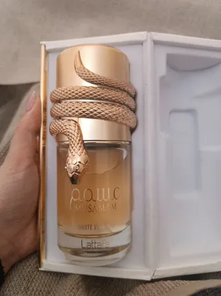 Este perfume de Lattafa presenta un diseño llamativo con una serpiente dorada enrollada alrededor del frasco. - Fragancia: Musamam White Intense. - Capacidad: 100ml. - Presentación: Frasco con detalle de serpiente dorada.