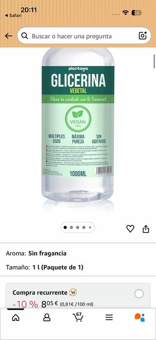 Glicerina vegetal pura de 1 litro, ideal para cosmética y cuidado personal. - Vegana y 100% vegetal. - Múltiples usos. - Máxima pureza. - Sin aditivos. - Envase de 1000ml.