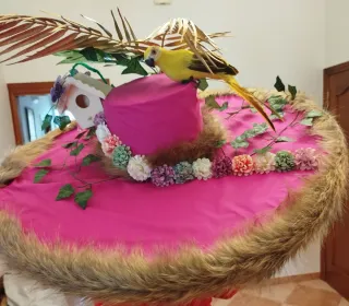 Este conjunto de disfraz incluye un sombrero y un body, ambos decorados con detalles festivos. - El sombrero tiene un diseño llamativo con un pájaro y flores. - Incorpora un pequeño nido de pájaro y hojas decorativas. - El borde del sombrero está adornado con pelo sintético.