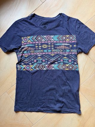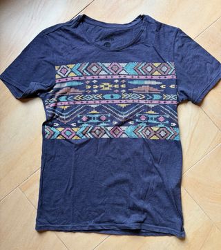 Camiseta de manga corta con un diseño llamativo en la parte delantera. - Estampado de estilo étnico o tribal. - Combinación de colores vivos y pasteles. - Cuello redondo. - Tejido suave y cómodo.