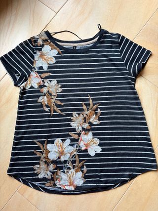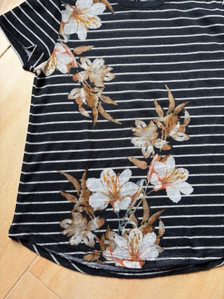 Camiseta de manga corta con un diseño original de rayas y flores. - Estampado de flores blancas y marrones. - Tejido suave y cómodo.