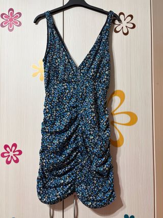 Vestido con estampado floral en tonos azules y negros. Presenta un diseño fruncido en la parte delantera que le da un toque moderno. - Escote en V. - Tirantes finos. - Tejido ligero.
