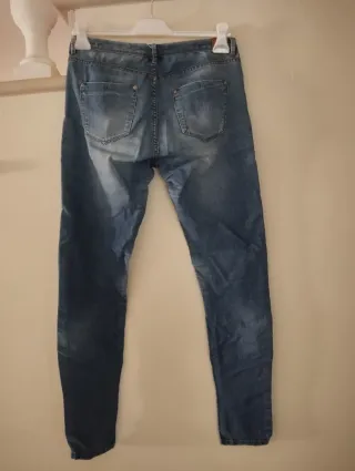 Vaqueros de corte ajustado con un lavado desgastado. - Cintura ni muy baja, ni muy alta. - Cierre de cremallera y botón. - Bolsillos delanteros y traseros.